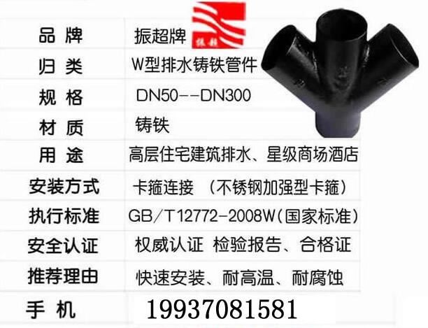 振超牌W型鑄鐵排水管件,鑄鐵,卡箍連接;快速安裝,耐高溫,耐腐蝕;用于高層住宅建筑排水、星際商場酒店。