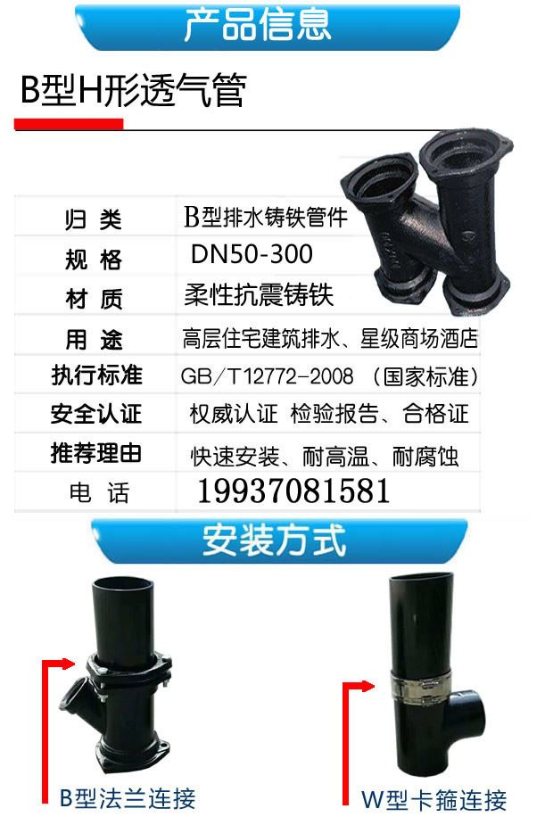 離心機制抗震柔性鑄鐵排水管件B型H形透氣管,柔性抗震鑄鐵,快速安裝,耐高溫,耐腐蝕;用于高層住宅建筑排水、星際商場酒店。