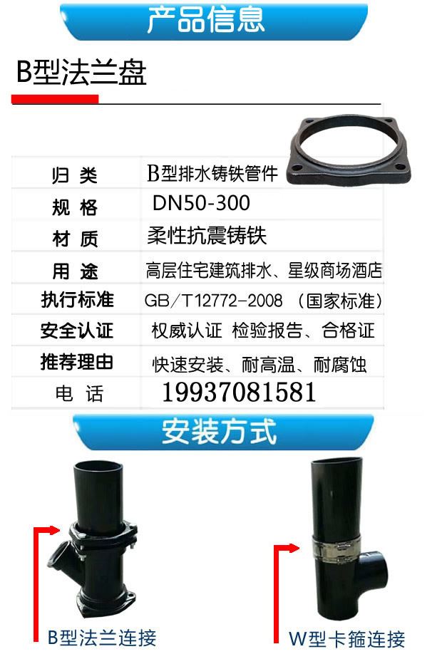 B型法蘭盤 柔性鑄鐵管排水專用管件 (含膠圈) 法蘭盤膠圈廠家,快速安裝,耐高溫,耐腐蝕;用于高層住宅建筑排水、星際商場酒店。